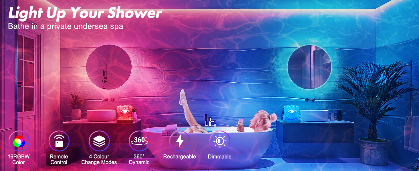 【Bathroom Aquarium Experience】The exterior of the shower light is created with a cubic crystal design shade. Featuring 5 light-emitting surfaces and built-in rotating LED beads, it casts a mesmerising dynamic water ripple light across the ceiling and walls. Transforms your bathroom into a cosy underwater oasis, perfect for relaxing baths, spas