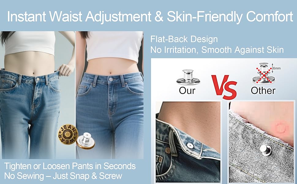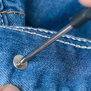 Quick Fix for Loose Jeans or Pants Easily adjust the waist of jeans that are too loose or too tight. These jean buttons for loose jeans snap in place without sewing, making them great for waist tightening on denim pants and other fitted garments.