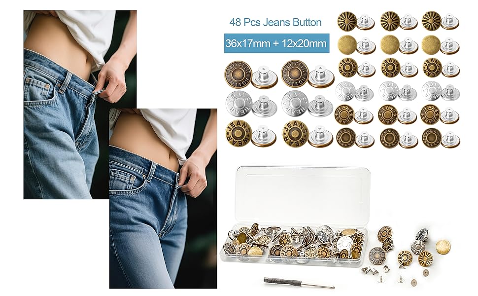 Complete Kit for Jean Button Replacement This kit includes 36pcs 17MM and 12pcs 20MM metal jean buttons, a mini screwdriver, and a clear storage box. Designed for replacing broken or lost jean buttons on pants, jackets, or other clothes—ideal for quick DIY repairs.